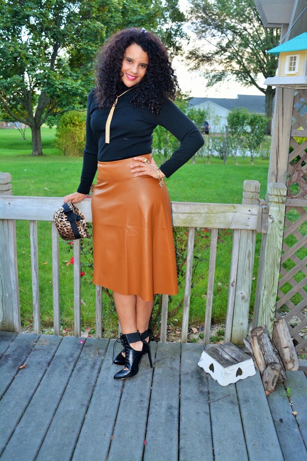 This first look I decided to pair the skirt with the faux leather top also from the Worthington line at Jcpenney . I actually saw the top in the store and loved the color and the quality so I knew I had to have the skirt the minute I saw it online. You know how some faux leather can look plastic and cheap that was not the case for this. I love pairing two matching pieces together giving you the illusion that it is a dress. I decided to add this Chaps Native American Inspired necklace that I lucked up on Kohl's clearance rack. This picture doesn't do this necklace justice .. I felt like an Indian Princess in this necklace. Luckily I had some pumps that matched this look perfectly !
